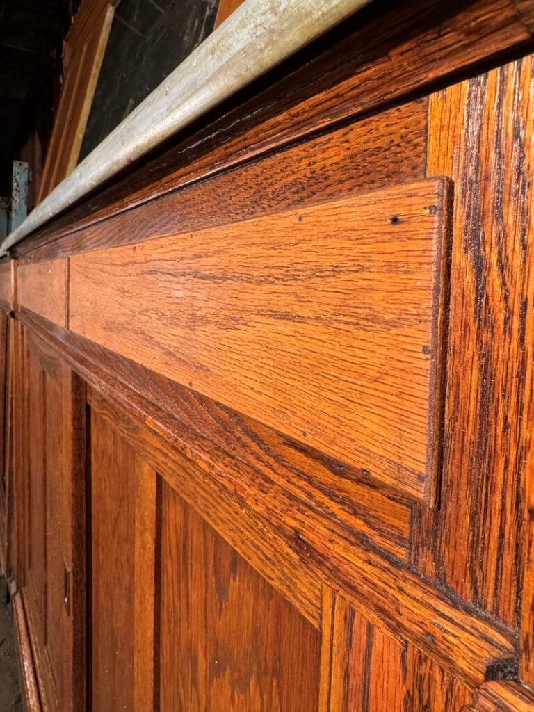 When measured from the floor, the back bar and upper back bar and mirrors are nearly eleven feet tall. The bar itself is twenty-two feet wide. The matching back-bar is also made of mahogany but is insulated and was once refrigerated.